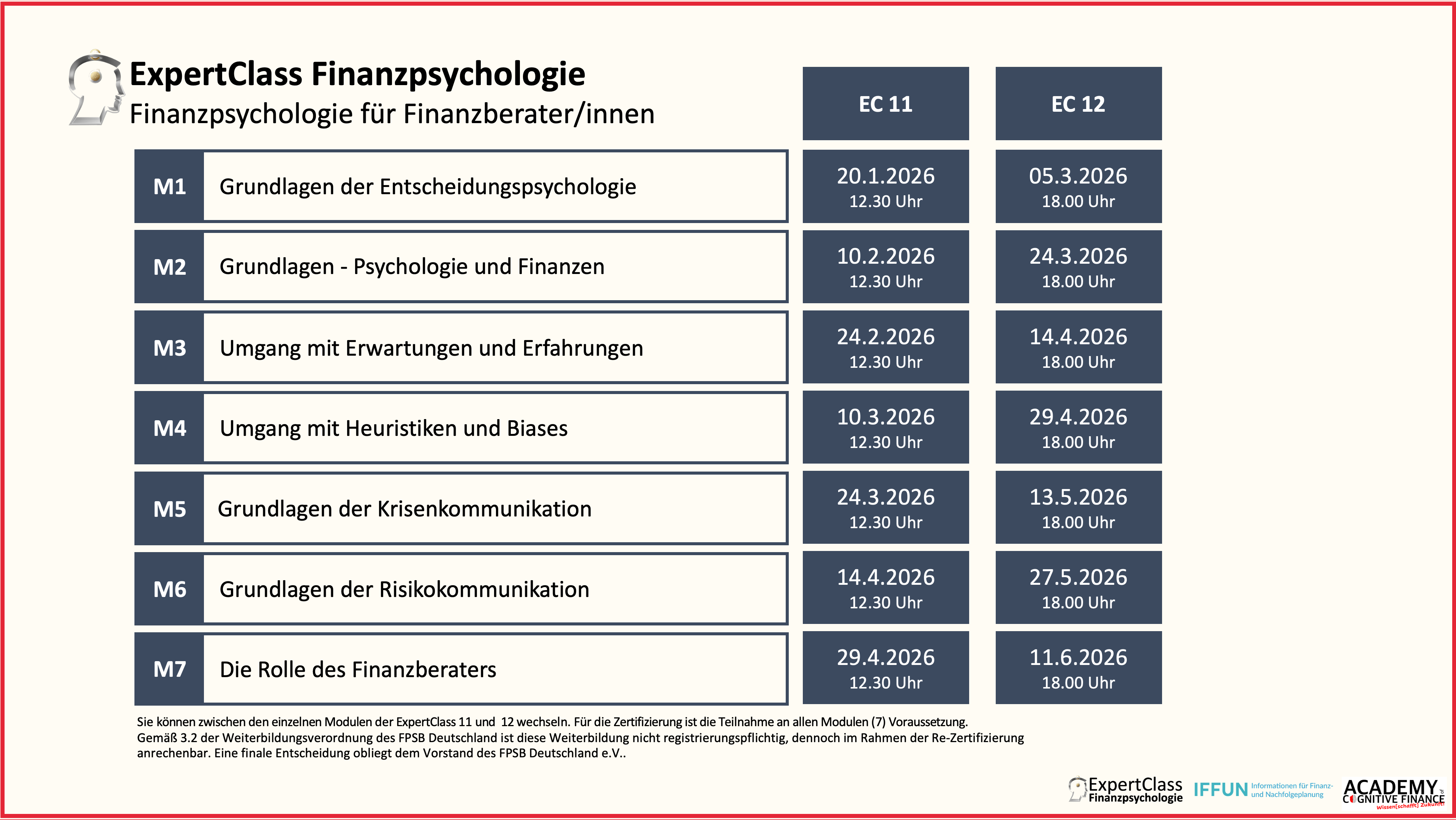 Gemäß 3.2 der Weiterbildungsverordnung des FPSB Deutschland ist diese Weiterbildung nicht registrierungspflichtig, dennoch im Rahmen der Re-Zertifizierung anrechenbar. Eine finale Entscheidung obliegt dem Vorstand des FPSB Deutschland e.V..